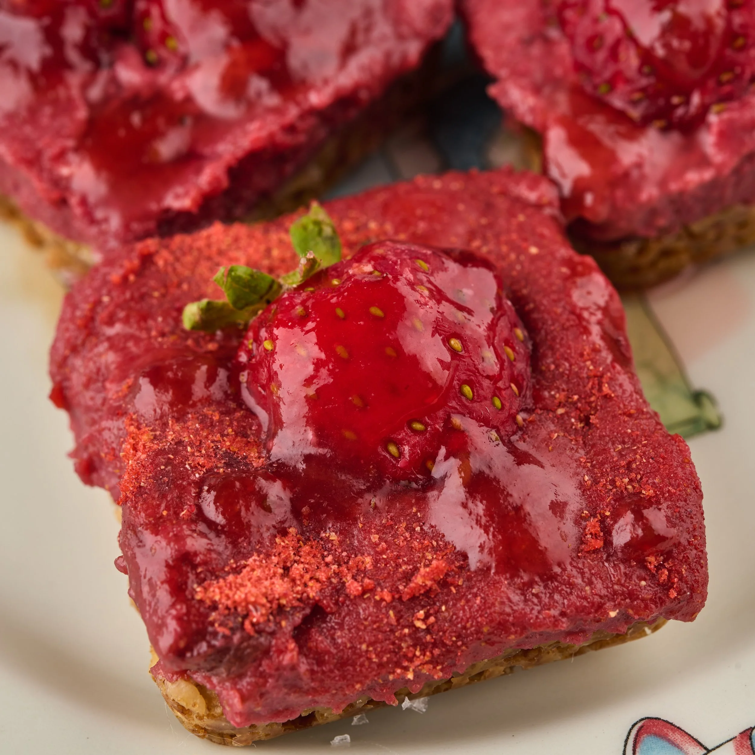 7. Remove bars from freezer and spread frosting over each bar base to half-inch (12mm) thickness. Cut up fresh strawberries and place on top of frosting to decorate. Return to freezer until ready to serve.